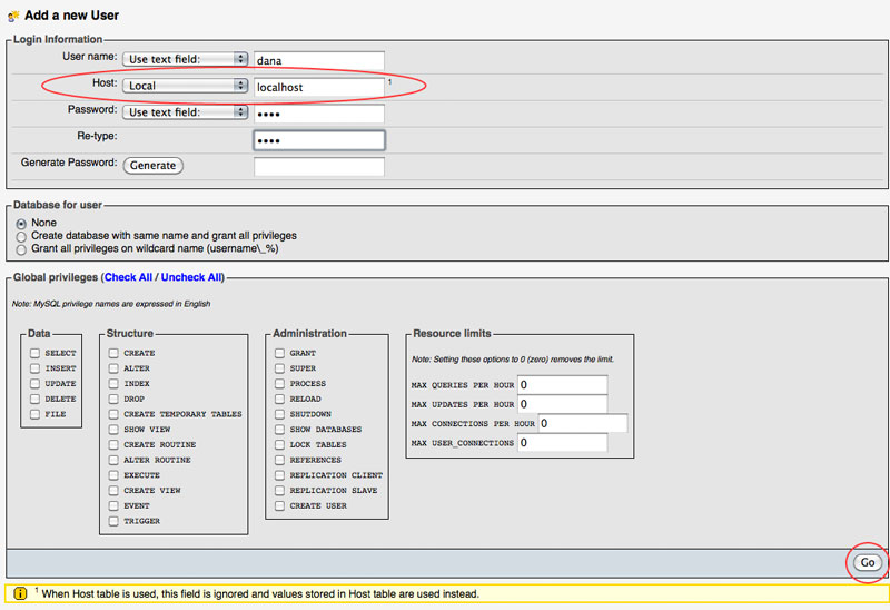 Fill out the login information with any username and password that you like. Make sure that you change the Host to Local. Leave everything else blank and click on the Go button near the bottom of the page.