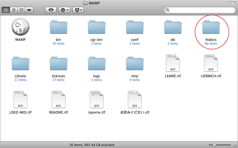 And it really is that simple... It probably took me longer to type out the steps than it will for you to get this server set up. Of course, there's no site or even a page or anything else set up yet. For that, you'll need to place your site into the htdocs folder inside the MAMP folder; it should be empty right now: