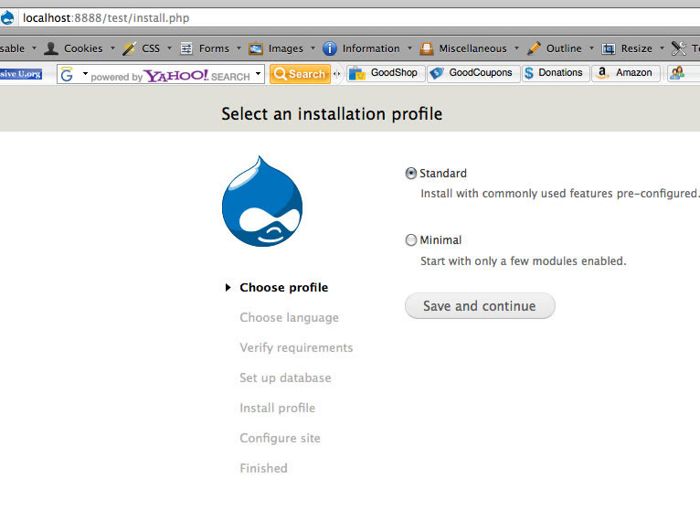 And with that, you should be ready to rock and roll. Point your favorite browser to your new local test server by going to http://localhost:8888/test and you should see the start up screen for your new Drupal installation. Of course, if you named your test server something other than test, you'll need to point your browser to that folder instead.