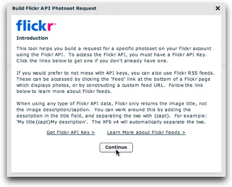 Once you click Continue, you will be prompted to enter the username of the Flickr account which holds the photoset(s) you want to use, and your Flickr API key: