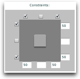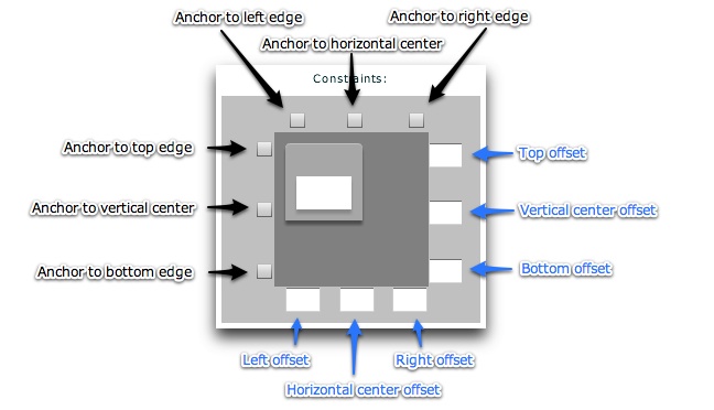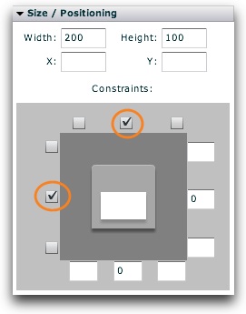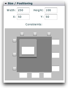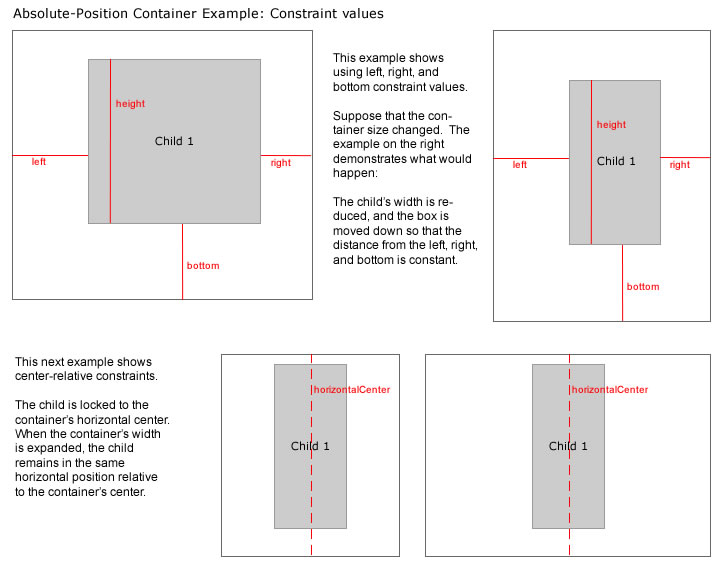 • Constraint dimensions - The left, right, top and bottom constraint properties can be used to anchor each side of a component to the corresponding edge of a container.    The edges of the component stay a constant distance from the corresponding container edges, regardless of the container size.    For example, you can specify a left value to lock the element to the left size of the container, and/or specify a right value to lock the element to the right edge of the container; these constraints will remain in effect even if the container changes size.    If you specify constraints for both aspects of a given dimension (e.g. both left and right, or both top and bottom), the width or height will automatically be determined based on the space needed to be filled.    Center-based constraints can also be used, positioning an element relative to the horizontal and/or vertical center of the parent container; this is done through the horizontalCenter and verticalCenter values.    Because of the flexibility afforded when making changes later on, constraints are the best way to position and size elements.