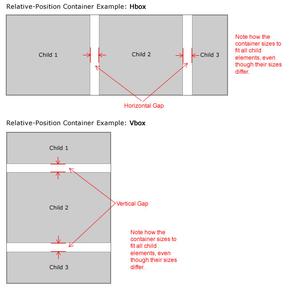The following diagram illustrates the concept of two different relative-position containers -- the HBox and VBox, the most commonly used containers: