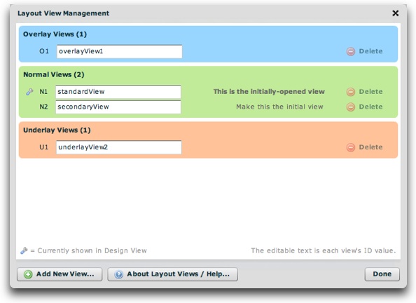 A visual representation item is shown for each view, grouped by view type. The editable text box represents the view's ID value (only required for Normal views). This ID value is used to identify the view when changing between Normal views. Therefore, you should enter a meaningful name for each Normal view, and not modify it if you have referenced it elsewhere (e.g. in a LayoutJumpButton element).
